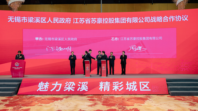 3月4日下午,苏豪控股集团与无锡市梁溪区人民政府在无锡隆重举行江苏苏豪(无锡)科创园项目战略合作签约仪式。苏豪控股集团党委书记、董事长王正喜与无锡市委书记黄钦进行座谈并出席签约仪式。控股集团总裁、党委副书记周勇,梁溪区委书记许立新分别在签约仪式上致辞。周谦副总裁,无锡市委常委、常务副市长朱爱勋参加签约活动。王正喜董事长首先对无锡市各级党委、政府对苏豪控股集团驻锡企业的关心表示感谢。他指出,无锡市制造业等实体经济实力雄厚、营商环境优越,苏豪控股集团有多家驻锡企业,其中江苏省纺织研究所是省内唯一以新型纤维为重