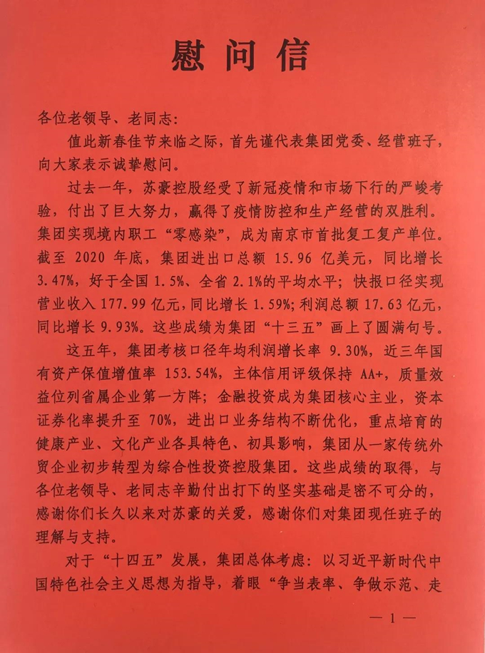 农历正月初七是新年上班第一天,集团领导班子成员在党委书记、董事长王正喜带领下,走访了驻苏豪国际广场总部各部门及各子公司,给广大干部职工拜年,并勉励大家快速转换状态,以饱满的热情投入到工作中,再接再厉,奋发进取,在牛年新起点上开创事业发展新局面。集团总裁周勇、党委副书记姚蓓、纪委书记陈万宁、副总裁刘长春、副总裁周洪溶等领导一同给大家送上新春祝福和节日问候。干部职工纷纷表达对集团新一年发展的美好祝愿,欢声笑语间洋溢着喜庆的节日气氛。各单位都用“福”字贴纸、对联、中国结、牛年吉祥物等装饰办公区域,鲜花吐艳、悬灯