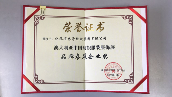 2020年11月12日,中国纺织品进出口商会在宁举办澳大利亚中国纺织服装展20周年纪念活动,表彰为澳展成长壮大做出的突出贡献的参展企业和展览公司,苏豪控股集团被授予“澳大利亚中国纺织服装服饰展品牌参展企业奖”,集团党委