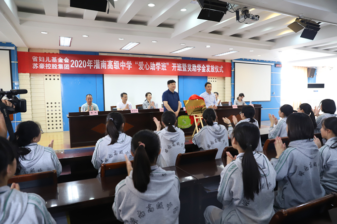 5月28日下午,苏豪投资集团捐建的灌南高级中学“苏豪爱心助学班”举行揭牌暨助学金发放仪式,苏豪控股集团党委副书记姚蓓、灌南县副县长王经卓为爱心助学班揭牌,省妇儿福利基金会副秘书长马晨霞、苏豪投资集团董事长薛炳
