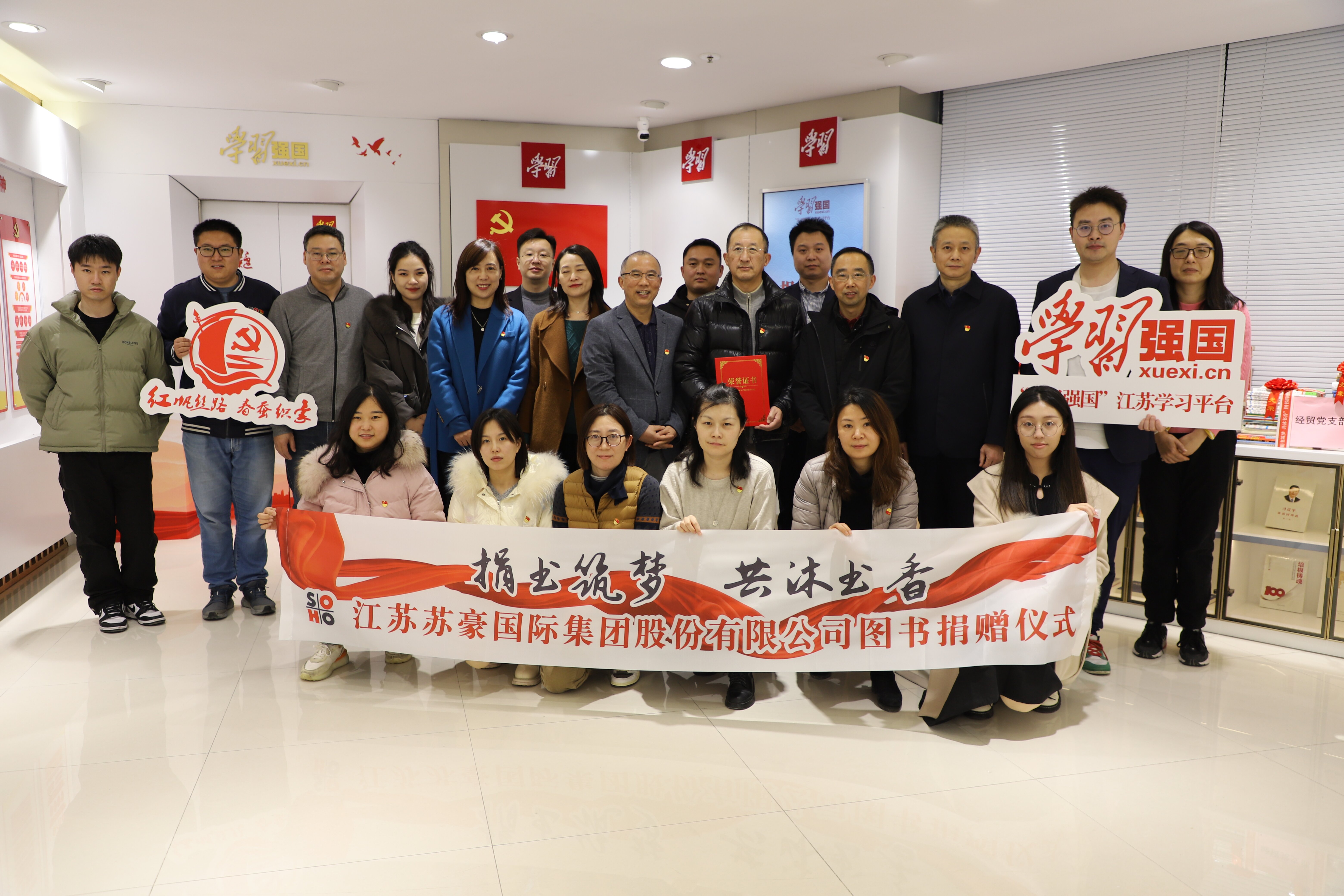 书页因翻动而飞翔,知识因分享而流动。为了帮助少年儿童特殊群体,培育孩子们的阅读兴趣,结合深入学习宣传贯彻党的二十大精神,贯彻落实习近平总书记关于全民阅读、建设书香社会的重要指示精神,苏豪股份联合“学习强国”江苏学习平台共同开展“捐书筑梦 共沐书香”图书捐赠活动,并于2月10日在党群活动中心举办集体捐赠仪式。