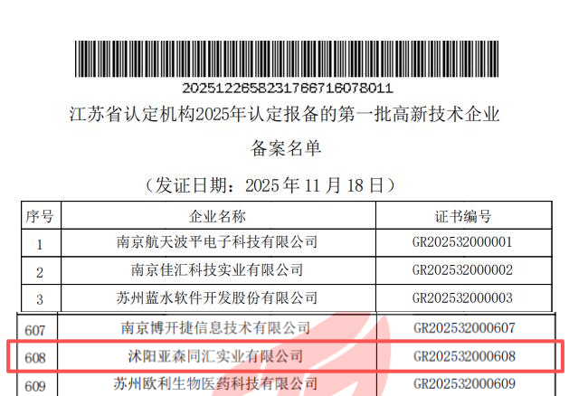近日,江苏省认定机构2025年认定报备的第一批高新技术企业备案名单出炉,苏豪亚森参股企业沭阳亚森同汇凭借扎实的研发实力、突出的创新成果及规范的管理体系,成功通过认定,正式跻身国家高新技术企业行列,标志着亚森同汇在技术研发创新、科技成果转化及企业可持续发展等方面的综合实力,获得了高度认可和权威肯定。